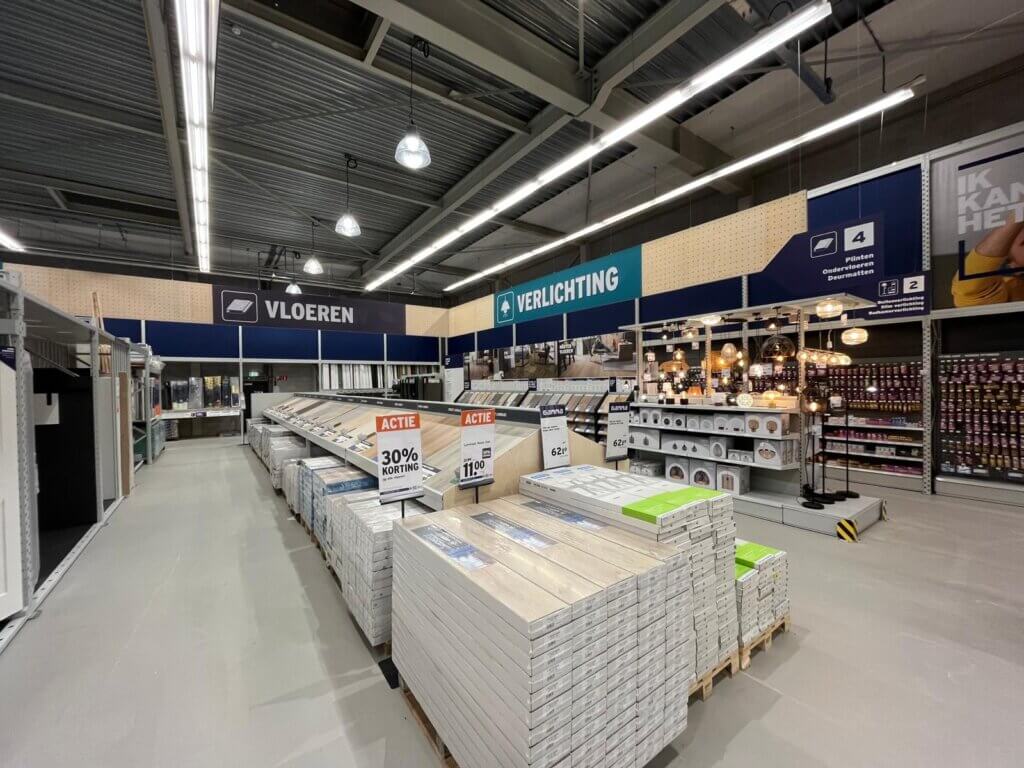 Ook de vloerenafdeling is volledig vernieuwd. De afdeling beschikt over een compleet vernieuwd assortiment en lage stellingen. Op het vloerenplein vinden klanten alles wat ze nodig hebben om een vloerenklus aan te pakken, van vloeren en ondervloeren tot vloerkleden. Daarnaast is er een grote inspiratiewand met showmodellen, aangevuld met informatie- en inspiratieborden die klanten op weg helpen met ideeën en praktische inzichten. Dit zorgt voor een mooie en functionele combinatie van een on- en offline beleving.